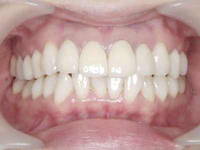 前歯の見た目が気になるとの主訴で来院された患者さまです。患者さまと相談し、セラミックのかぶせ物で前歯の見た目を改善しました。