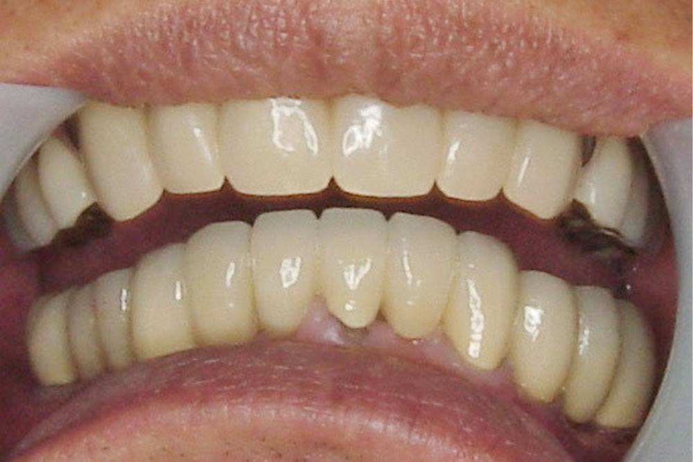 患者さまと相談し、前歯は上下でセラミックの被せ物、下の奥歯はインプラント、上の奥歯は入れ歯で治療しました。