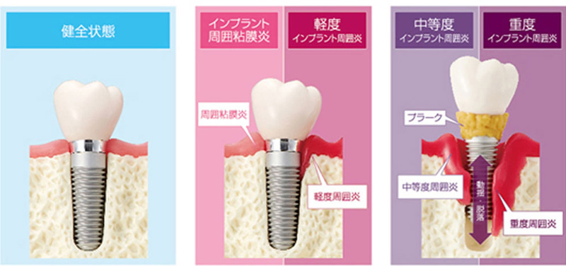 特に、インプラント周囲炎などの症状を発症するリスクが高く、症状が悪化するとインプラントが抜け落ちてしまうため、特に注意が必要です。