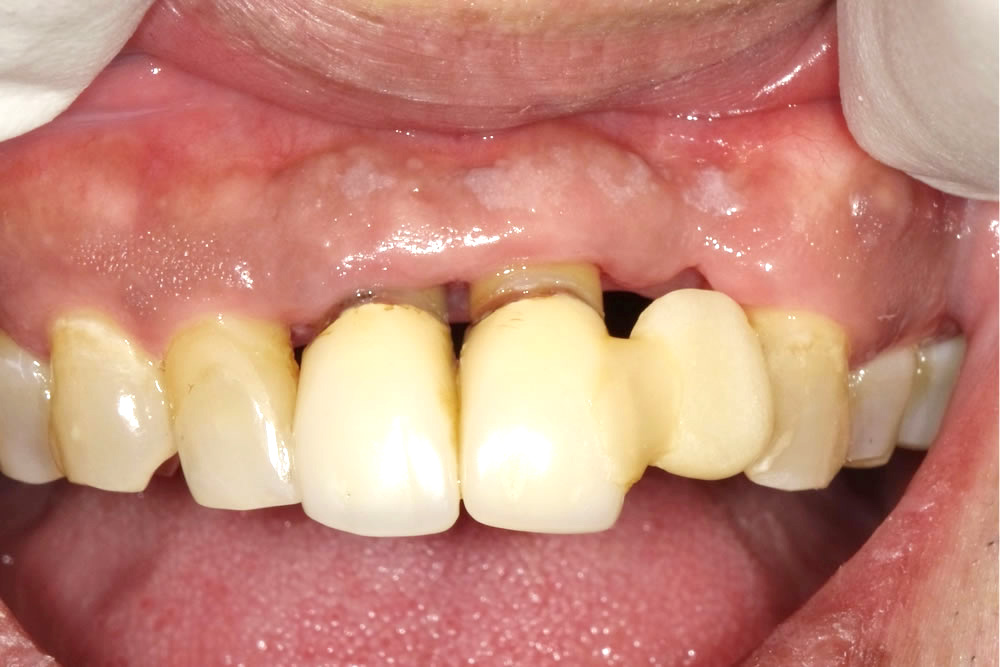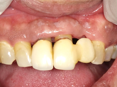 上記の3点から、前歯2本+欠損した歯の3本分のブリッジで奥に伸ばす設計(延長ブリッジ)としました。