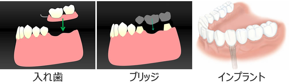 歯の抜け落ちた部分を治す方法は【入れ歯】【ブリッジ】【インプラント】の3つの方法があります。