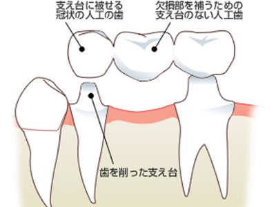 ブリッジは通常、欠損した歯の両隣の歯を削り連結させる方法です。